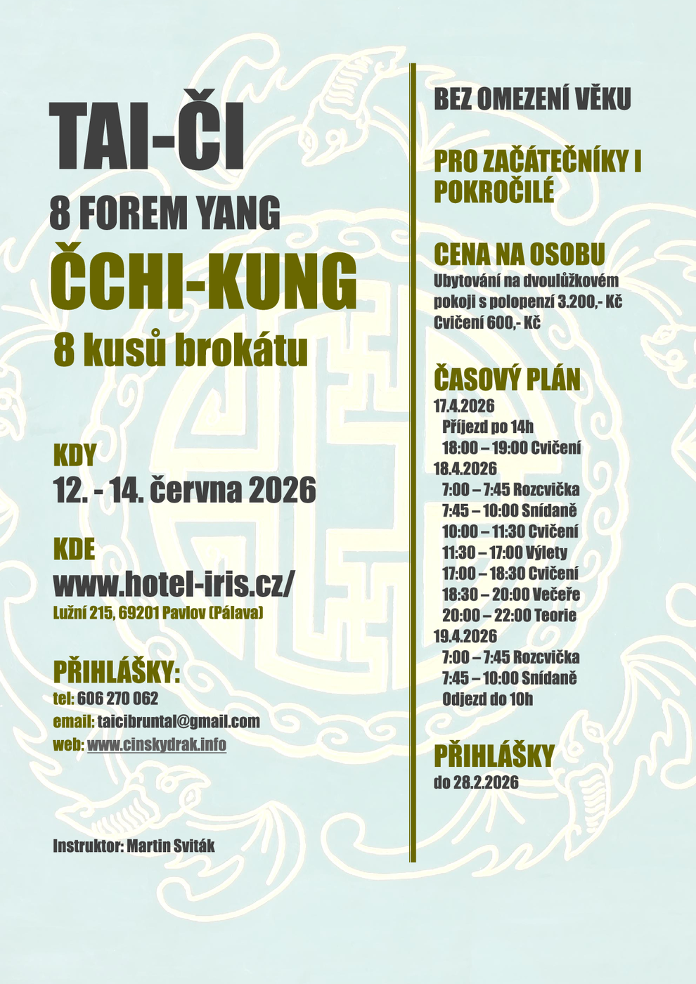 12.6 - 14.6. SEMINÁŘ/POBYT (PÁLAVA): Taiči "8" forem yang forma, čchi-kung 8 kusů brokátu